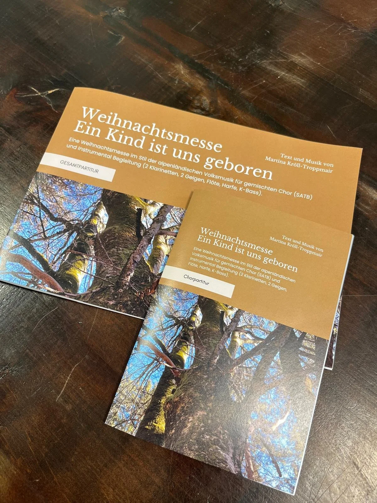 Die Weihnachtsmesse „Ein Kind ist uns geboren“ entstand aus meiner Liebe zur alpenländischen Volksmusik und zum einfachen, ehrlichen Musizieren. Sie ist für gemischten Chor (SATB) und Instrumental Begleitung (2 Klarinetten, 2 Geigen, Flöte, Harfe, K-Bass).Die Harfenbegleitung ist bewusst schlicht gehalten – und darf nach Belieben interpretiert werden. Die Lieder sind einfach zu singen und in Hochdeutsch sowie Latein gehalten.